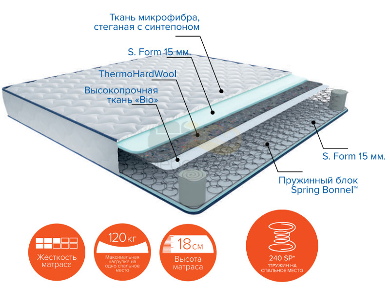 Наполнение: Зависимый пружинный блок "Spring Bonnel" (240 пружин на спальное место) + высопрочная ткань "Bio" + ThermoHardWool + ортопедическая пена S.Form 1 см.
