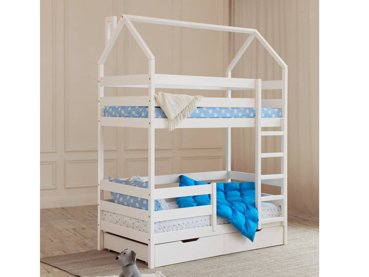 - Двухъярусная кровать-домик белый 80х160 см с ящиками