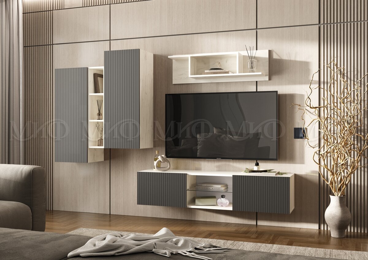 Гостиная навесная Оскар Графит, Дуб Крафт Белый