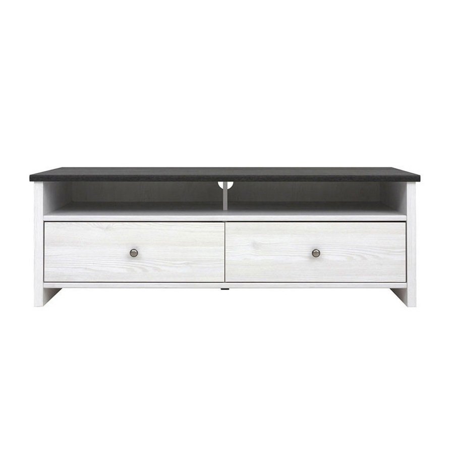 Тумба под телевизор содержит два выдвижных ящика на роликовых направляющих и два открытых отделения с отверстием в задней стенке для проводов. Оборудована небольшими круглыми металлическими ручками серебристого цвета.