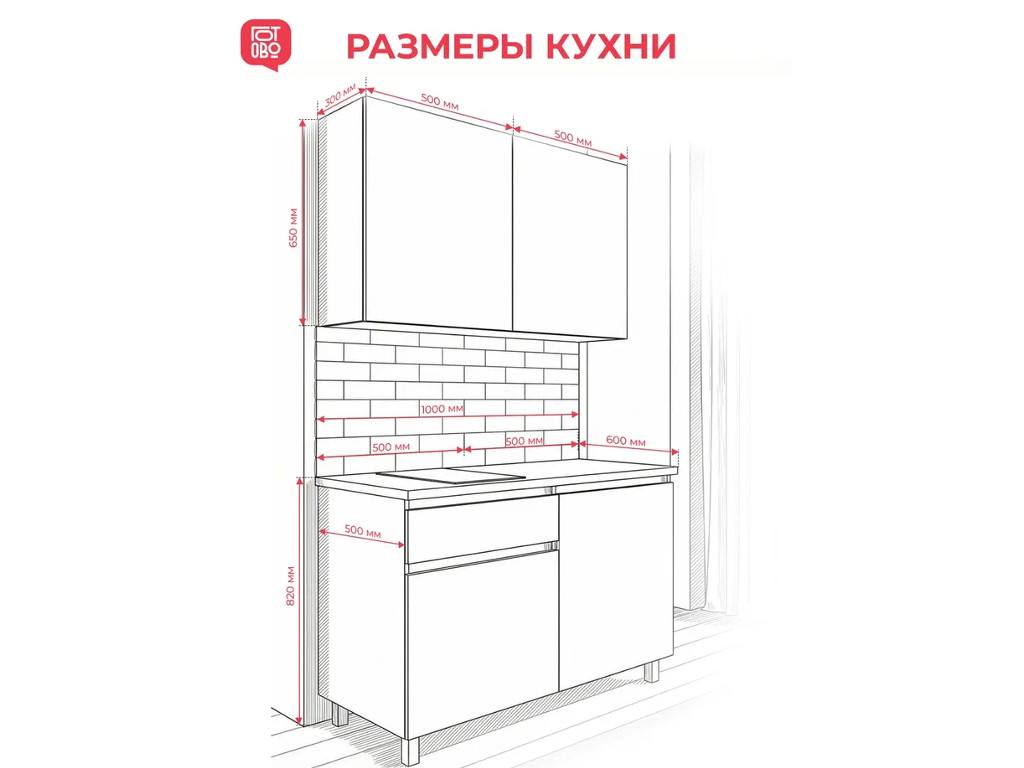 Высота нижних модулей с учетом столешницы и опор составляет 850 мм, глубина модулей - 500 мм.