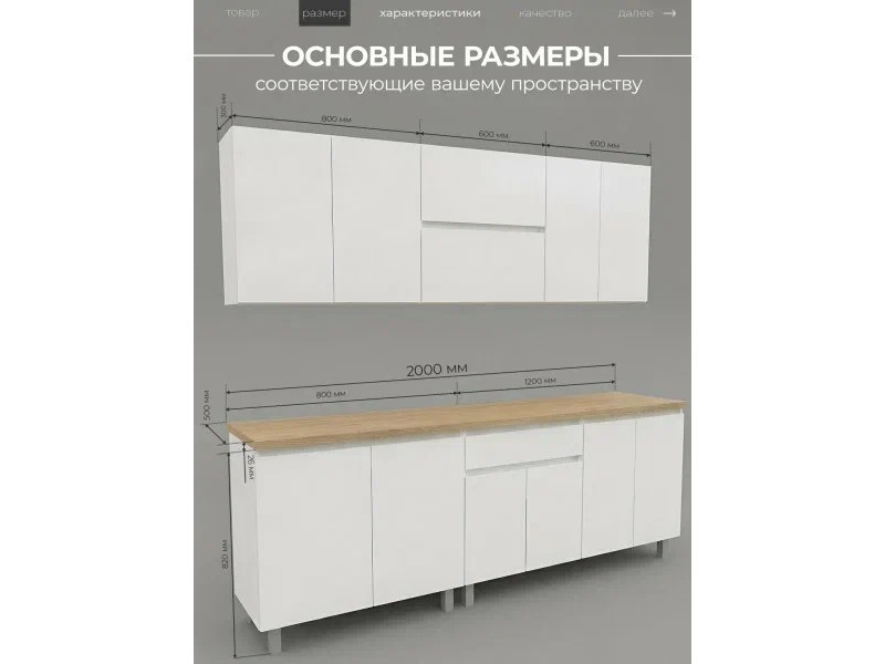 Высота нижних модулей с учетом столешницы и опор составляет 850 мм, глубина модулей - 500 мм.