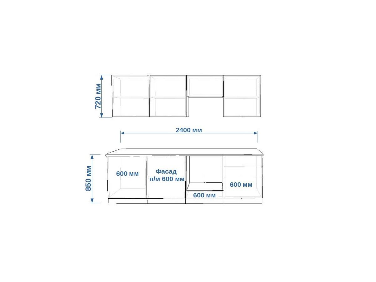 Кухонная мойка, стеновая панель, посудосушитель, планки для столешницы в комплект не входят.