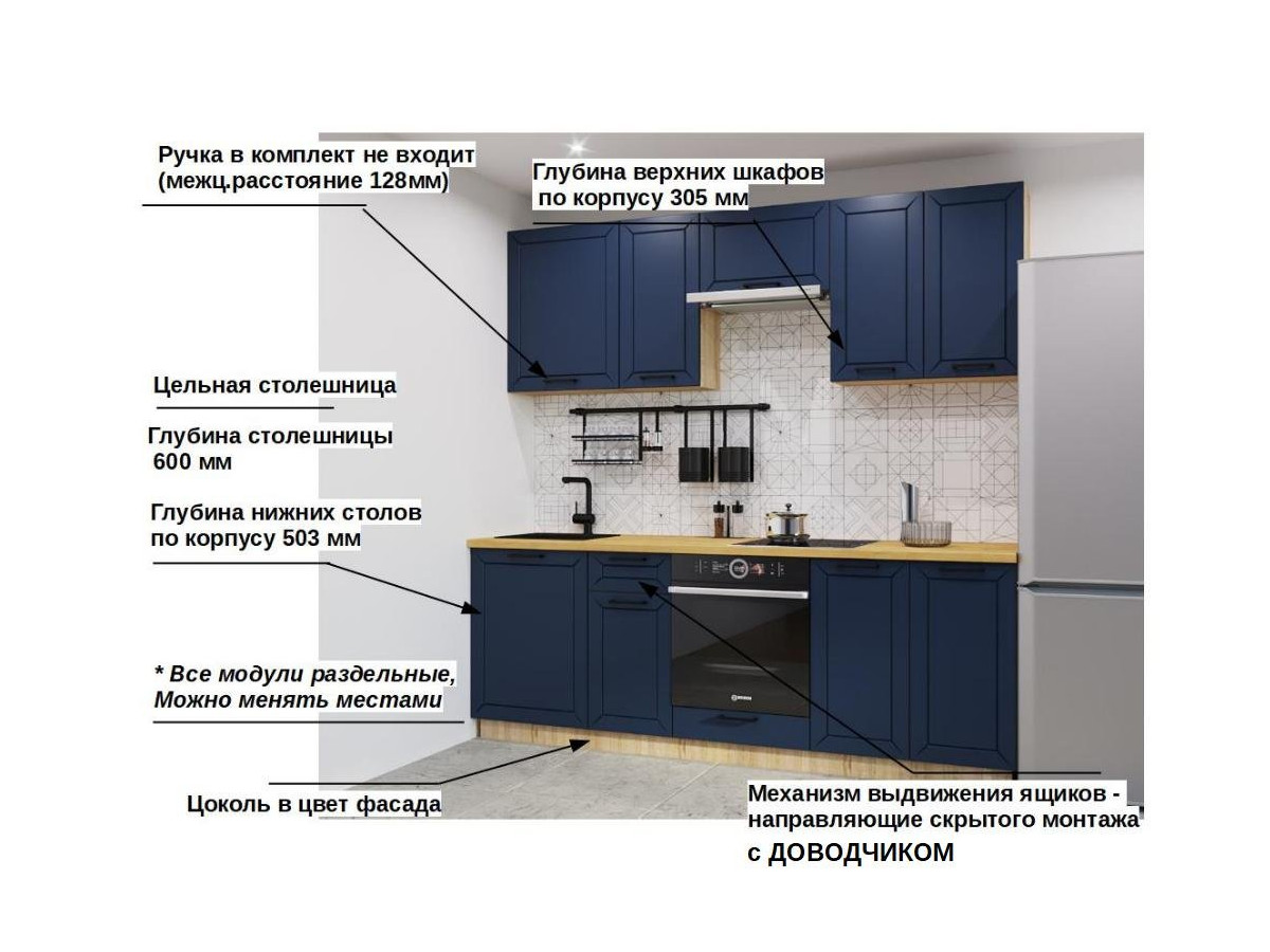 Кухонная мойка, стеновая панель, посудосушитель, планки для столешницы в комплект не входят.