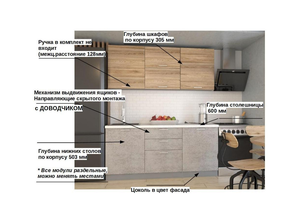 Кухонная мойка, стеновая панель, посудосушитель, планки для столешницы в комплект не входят.