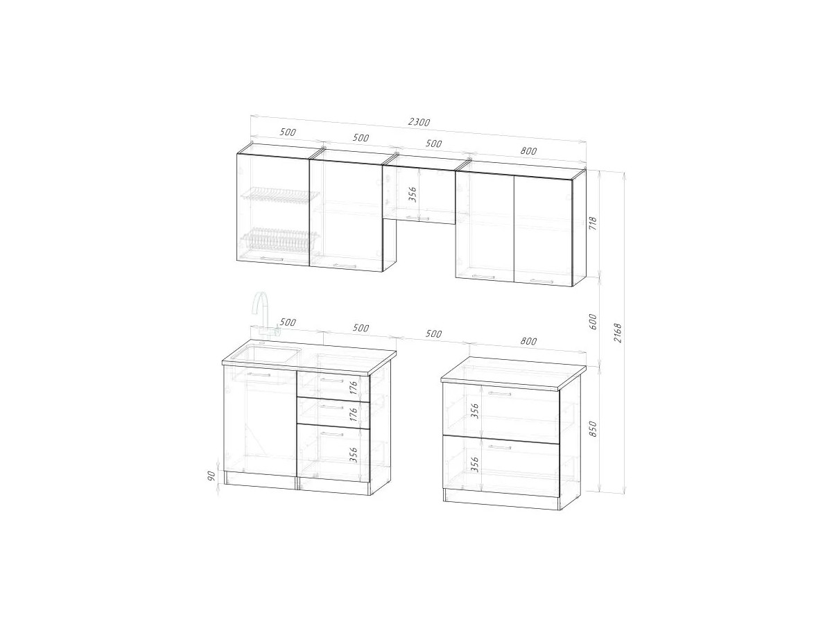 Мойка, смеситель, стеновая панель и посудосушитель в комплект гарнитура не входят.