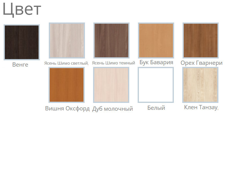 Цвета: Вишня риверсайд, Белый, Черный, Дуб молочный, Клен Танзау, Бук Бавария Светлый, Вишня Оксворд, Орех Гварненри, Венге Линум, Ясень шимо светлый, Ясень шимо темный.