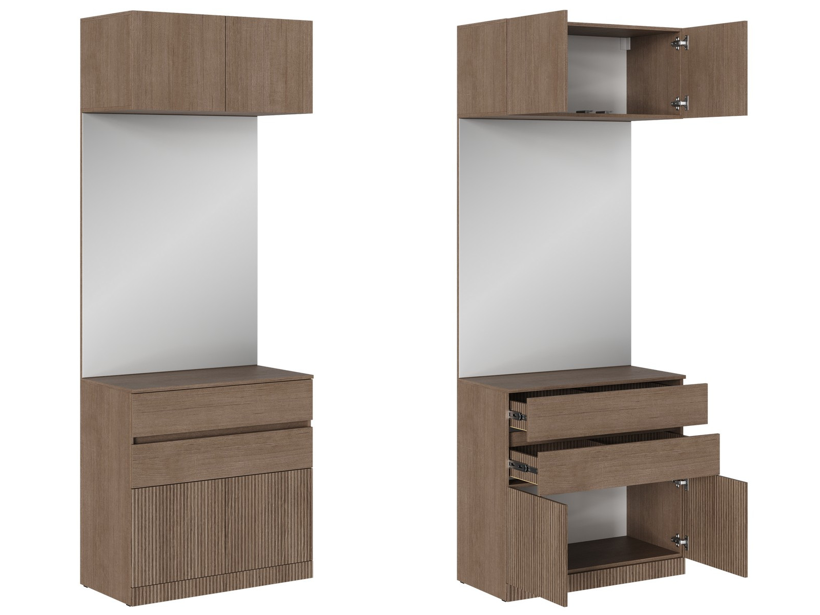 Створки – в цвет фасада ЛДСП. Створки без ручек – открывание при помощи Толкателей для дверей. Место хранения за нижними створками цельное, без перегородок.