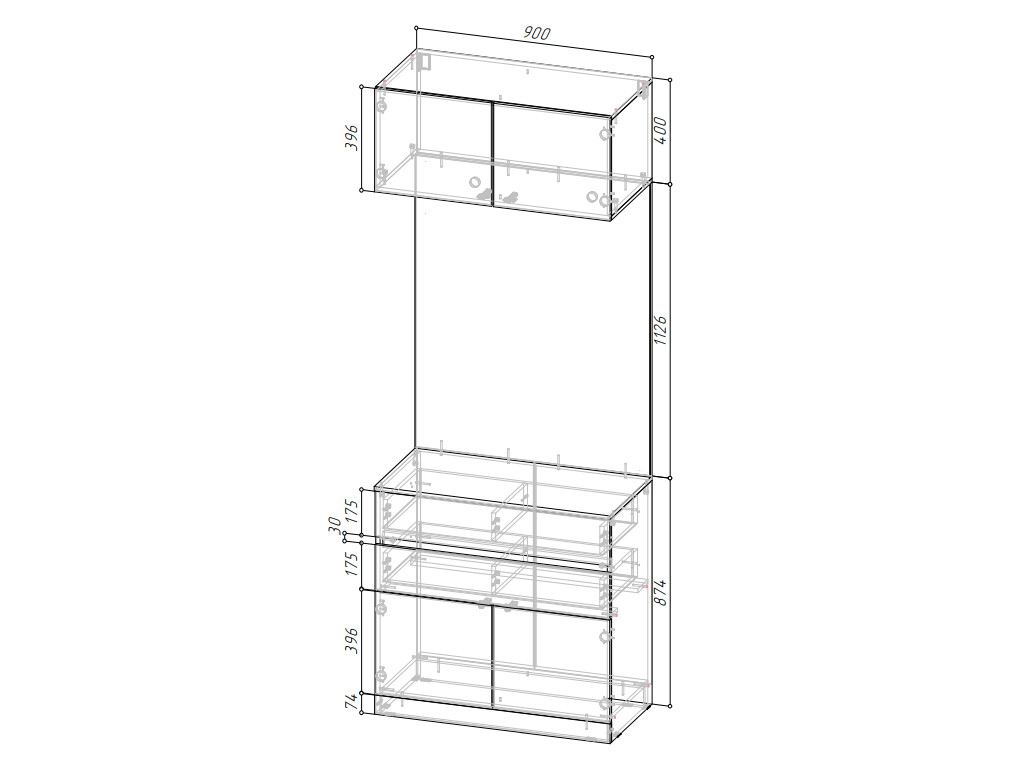 3)Нижняя часть представляет собой комод с двумя ящиками и двумя створками.