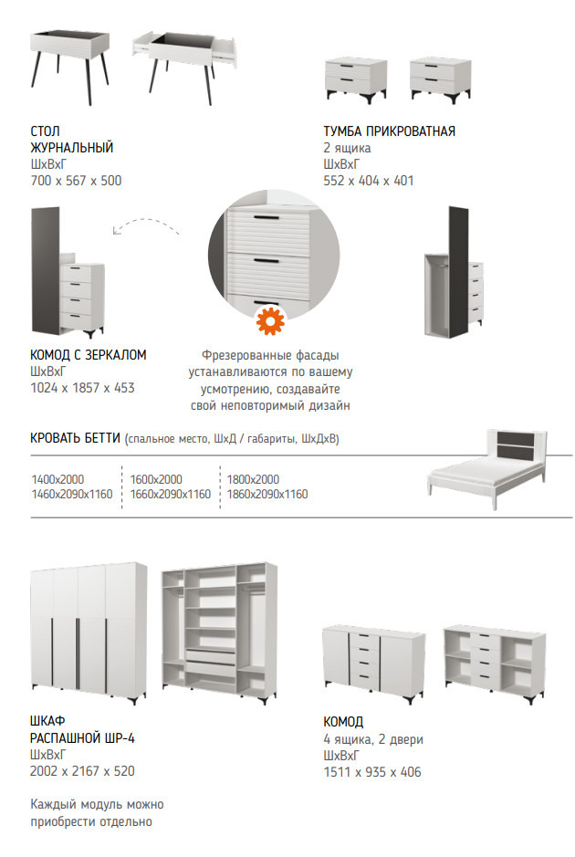 Цена указана за комплектацию на фото: шкаф ШР-4, комод с зеркалом, кровать Бетти 1400, Комплектующие на кровать с ламелями 1400 мм