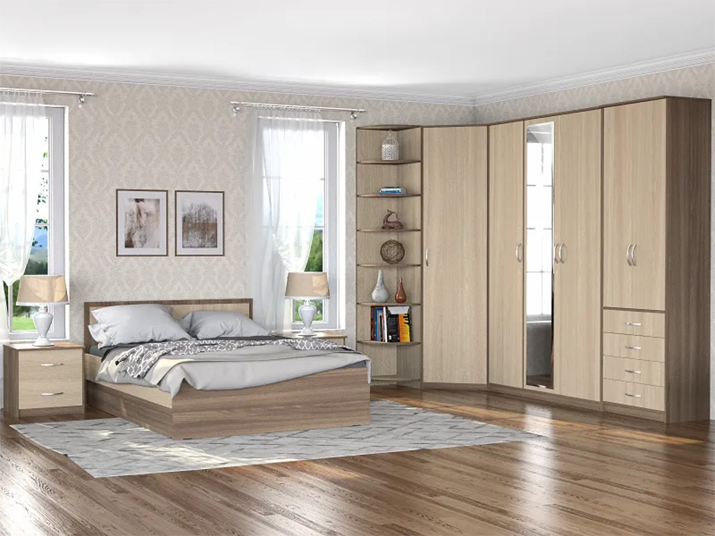 Состав комплекта: кровать-1200, тумба прикроватная - 2шт, шкаф универсальный, шкаф угловой (без зеркала), шкаф 3-х ств. (с зеркалом), стеллаж угловой