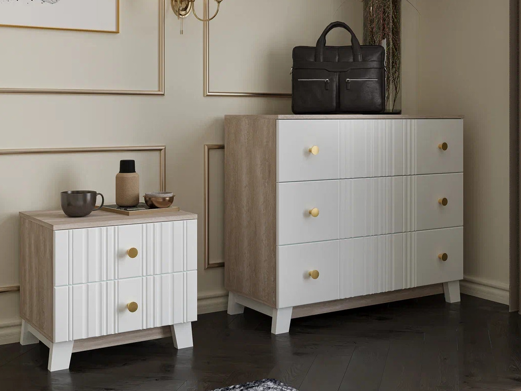 Цена за комплект: шкаф ШР-4, тумба прикроватная (2 шт), кровать двойная "Фрида" 1400, Комплектующие на кровать с ламелями 1400 мм, комод 3 ящика