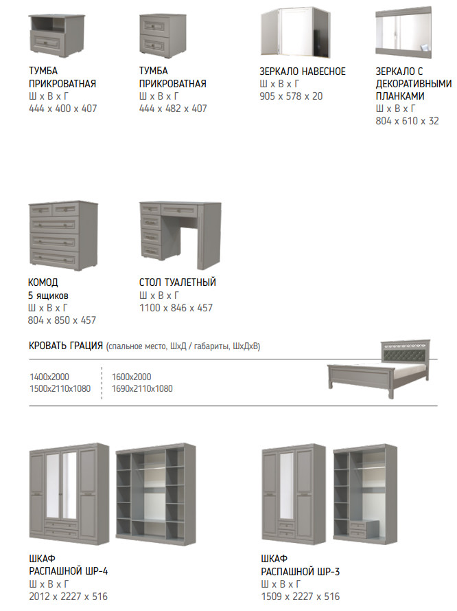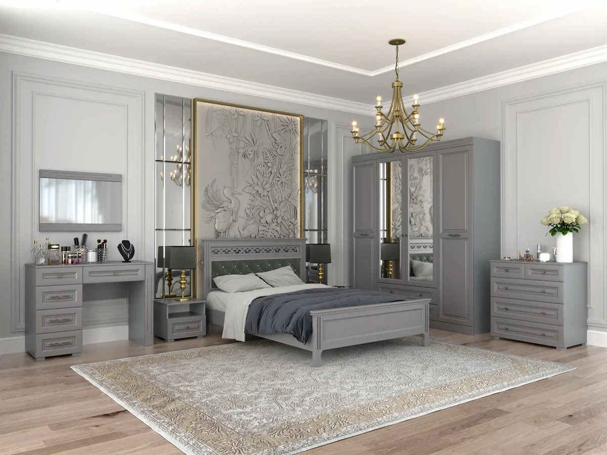Цена за комплект: зеркало навесное с декоративными планками, стол туалетный, тумба прикроватная 1 ящик, комод 5 ящиков, шкаф для одежды ШР-4, кровать двойная "Грация" 1400, Комплектующие на кровать с ламелями 1400 мм