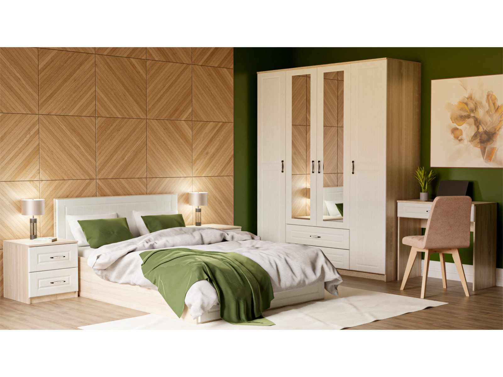 Состав комплекта: тумба прикроватная (2шт), кровать-1400, основание 1400, опоры для основания, шкаф 4-х створчатый, стол туалетный
