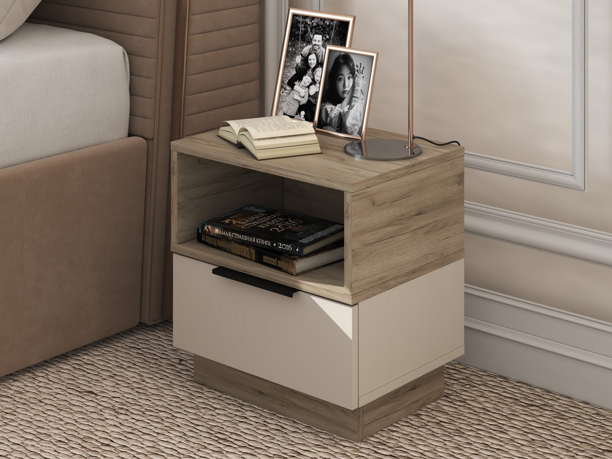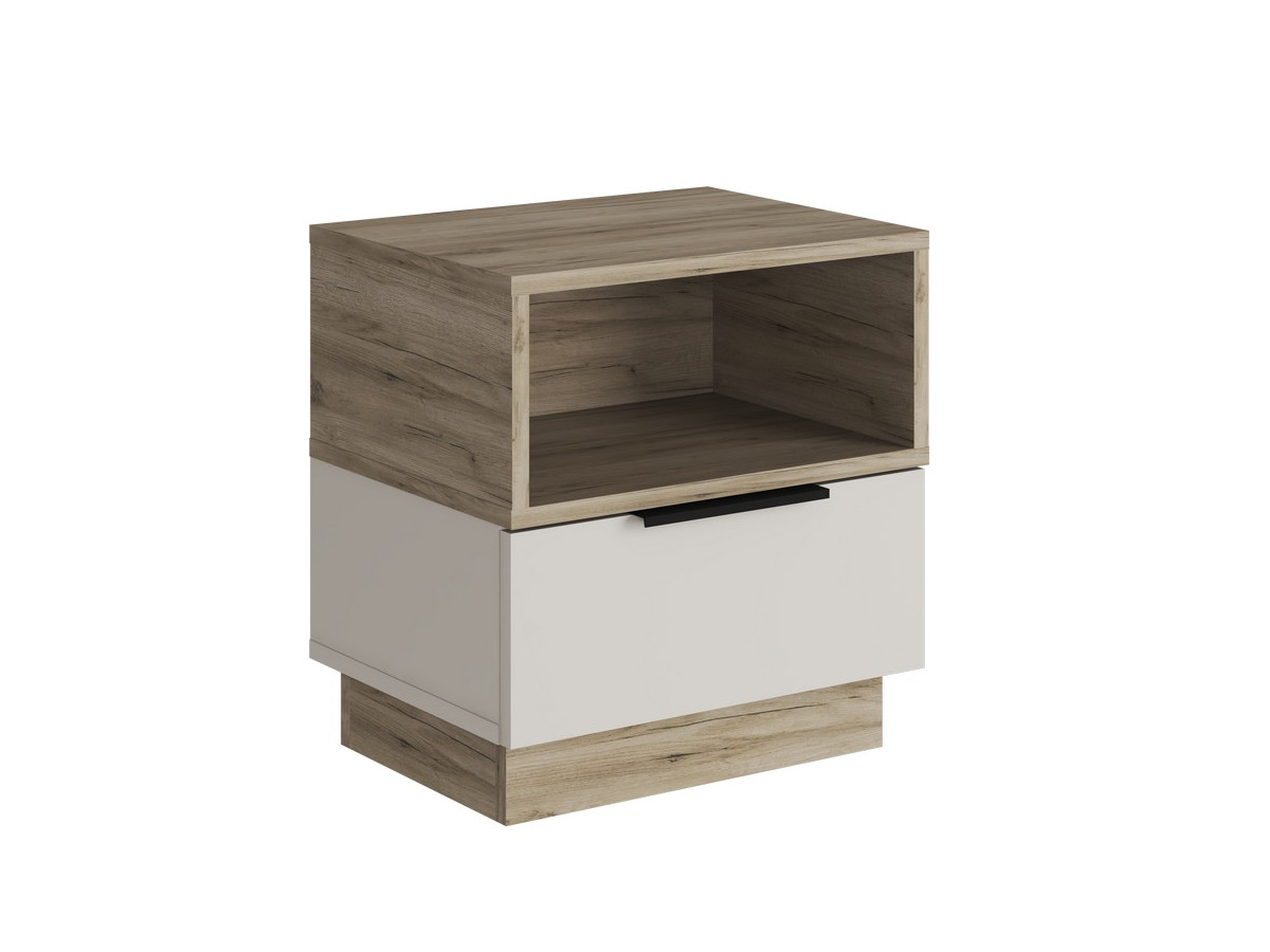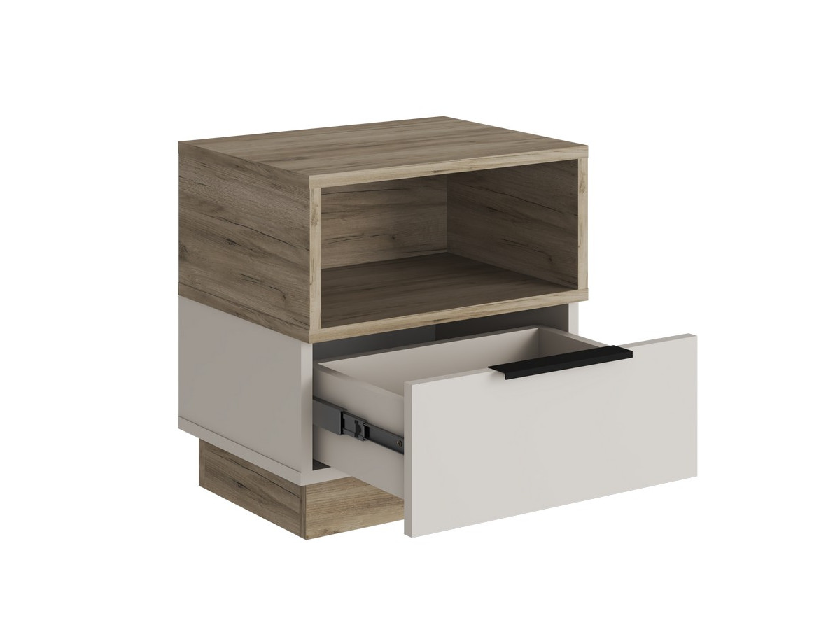 Средняя часть БОХО Тумба прикроватная – тумба с ящиком (Д.426 х В.176 х Г.330 мм). Ящик, с полезным объемом Д.336 х В.106 х Г.284 мм, крепится на шариковых направляющих полного выдвижения, длиной 300мм. Нагрузка на комплект направляющих – 10 кг с учетом веса ящика. Задняя стенка – ЛХДФ.