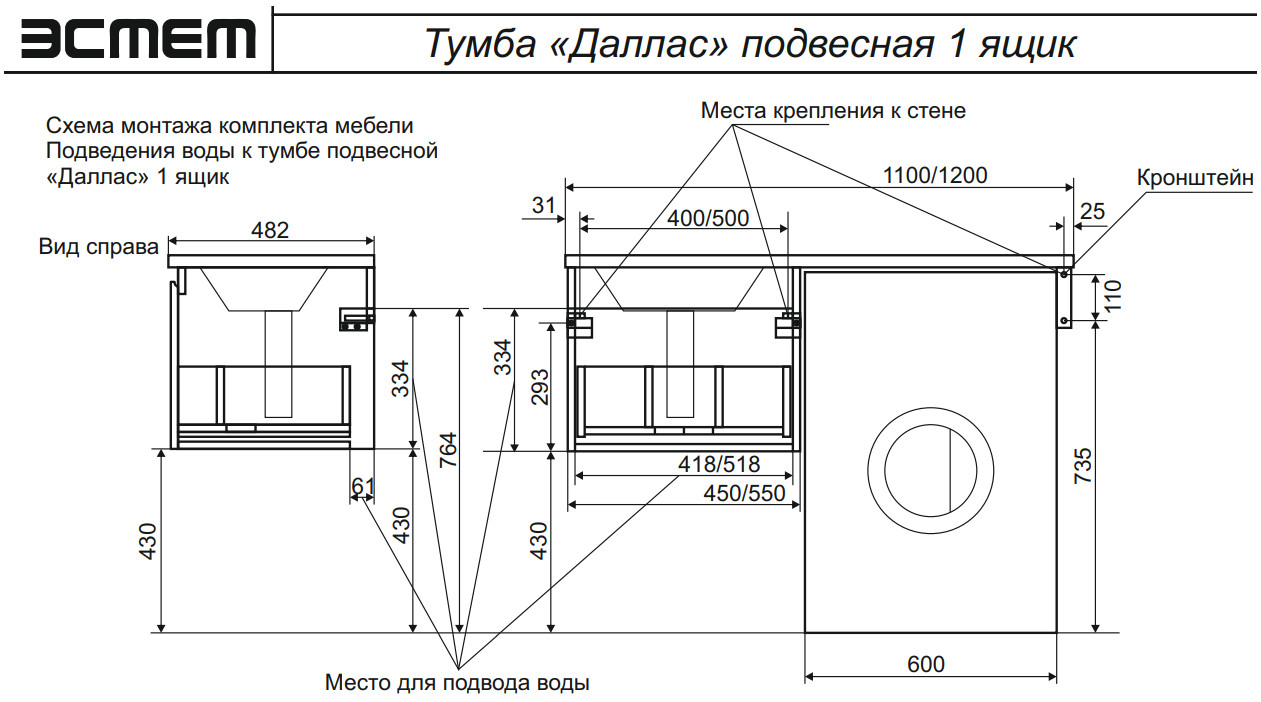 Тумба с раковиной Dallas Luxe 1150 навесная 1 ящик левая