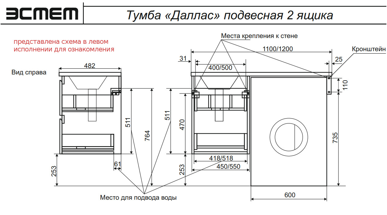 - Тумба с раковиной Dallas Luxe 1200 навесная 2 ящика правая