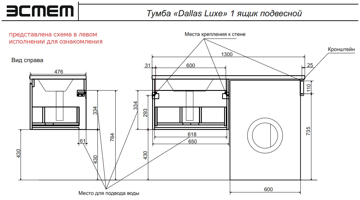 - Тумба с раковиной Dallas Luxe 1300 навесная 1 ящик правая