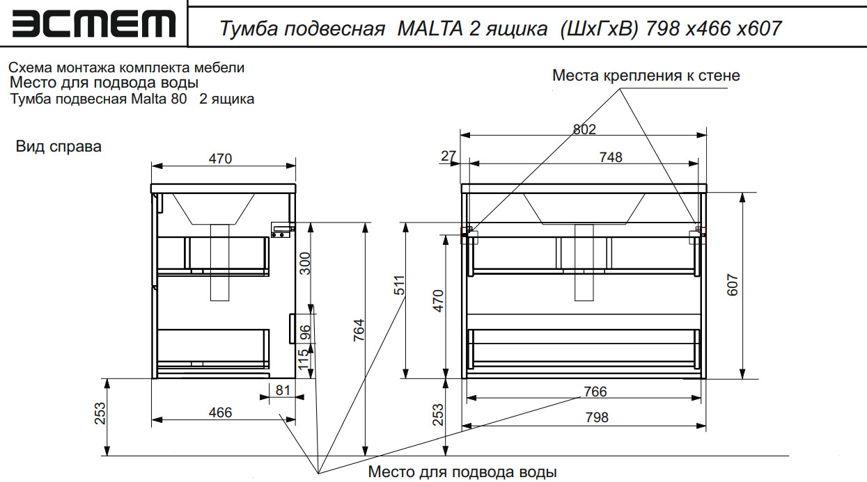 - Тумба с раковиной Malta 800 навесная 2 ящика