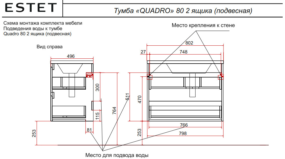 - Тумба с раковиной Quadro 800 навесная 2 ящика