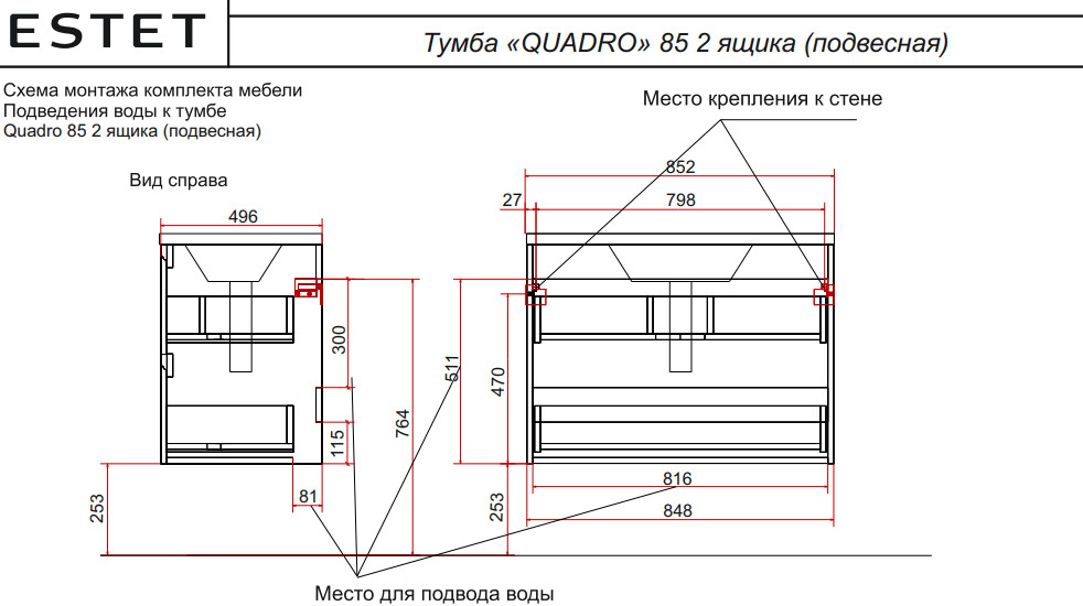 - Тумба с раковиной Quadro 850 навесная 2 ящика