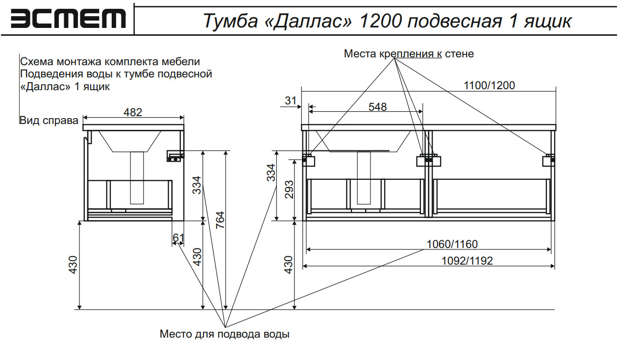 - Тумба с раковиной слева Dallas Luxe 1100 навесная 1 длинный ящик