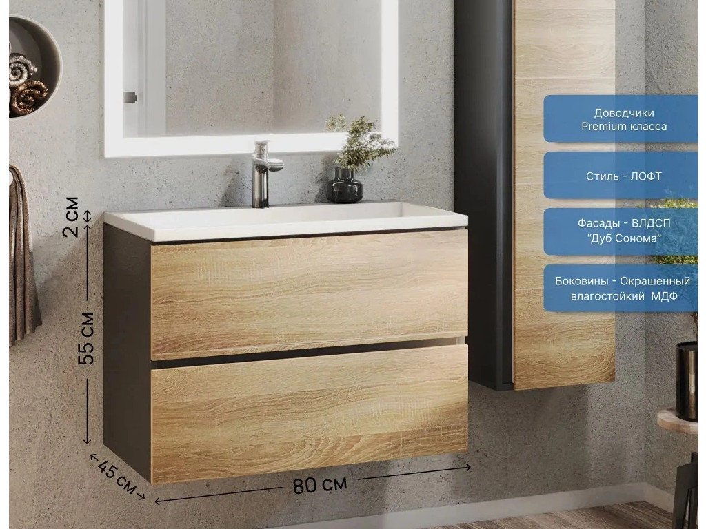 Тумба с раковиной Uperwood Barsa 80 см раковина белая-тумба черная/дуб сонома