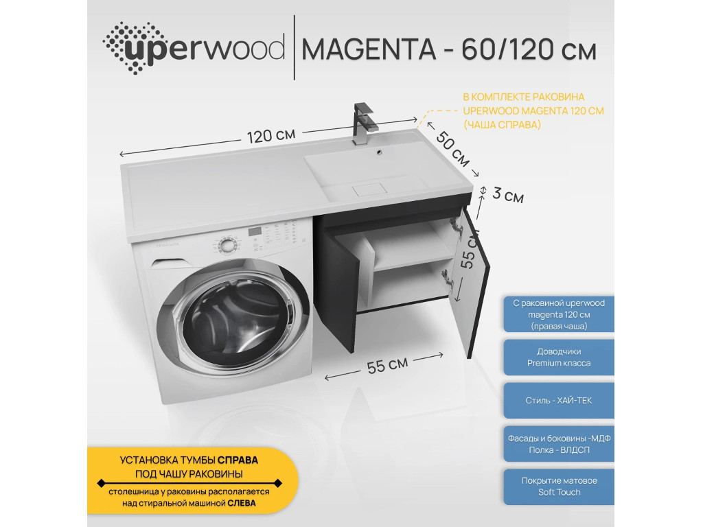 - Тумба с раковиной Uperwood Magenta 60-120 см подвесная черная с дверцами правая