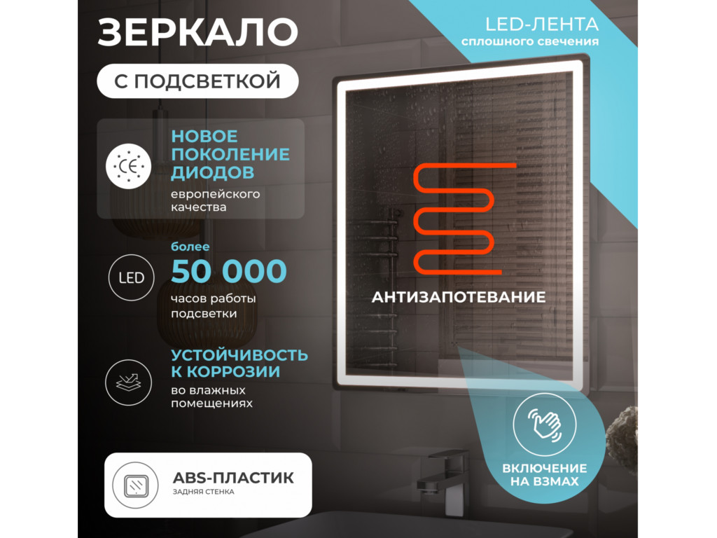 Подсветка фронтальная по периметру, с цветовой температурой 5000К – нейтральный белый, управление подсветкой бесконтактный выключатель «на взмах»