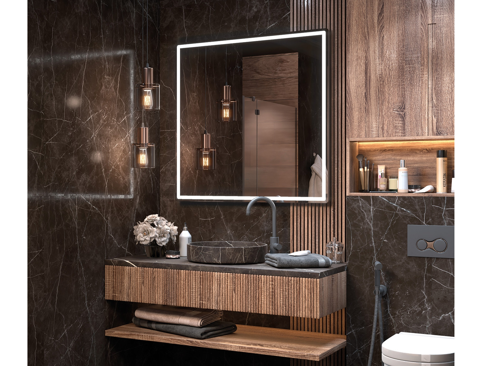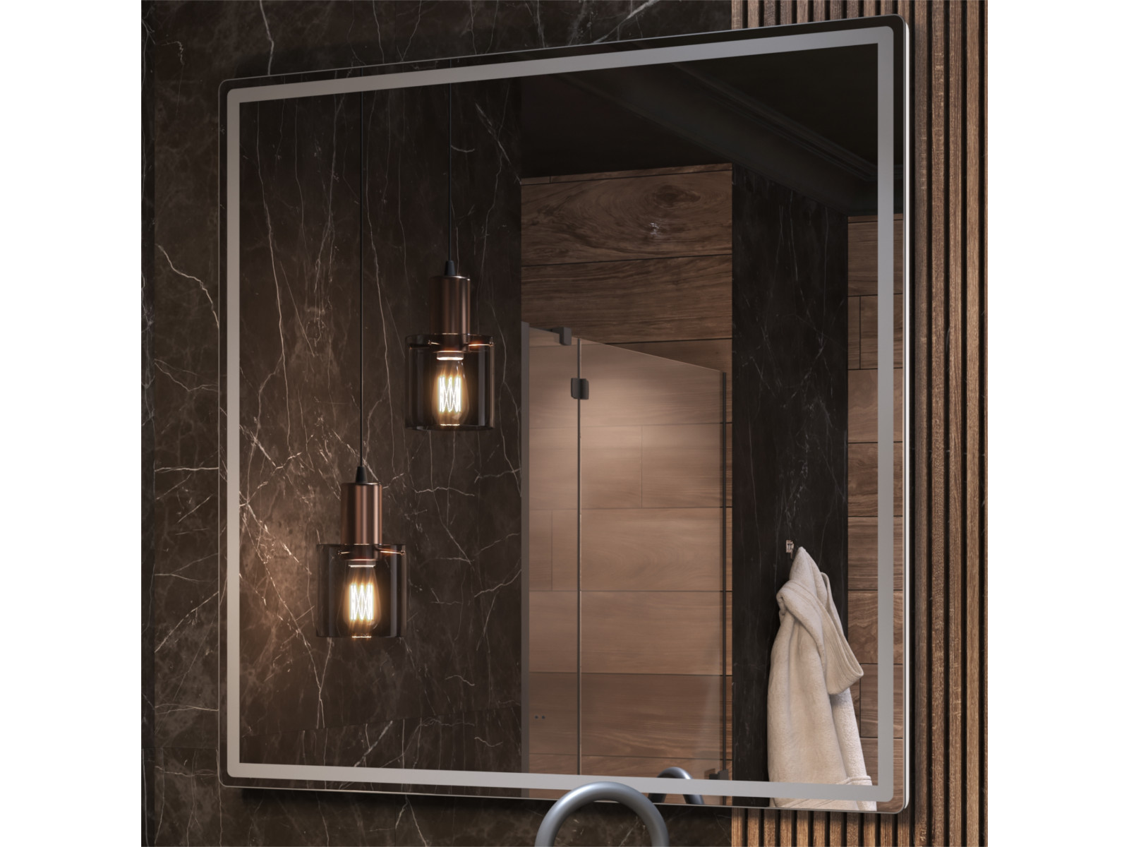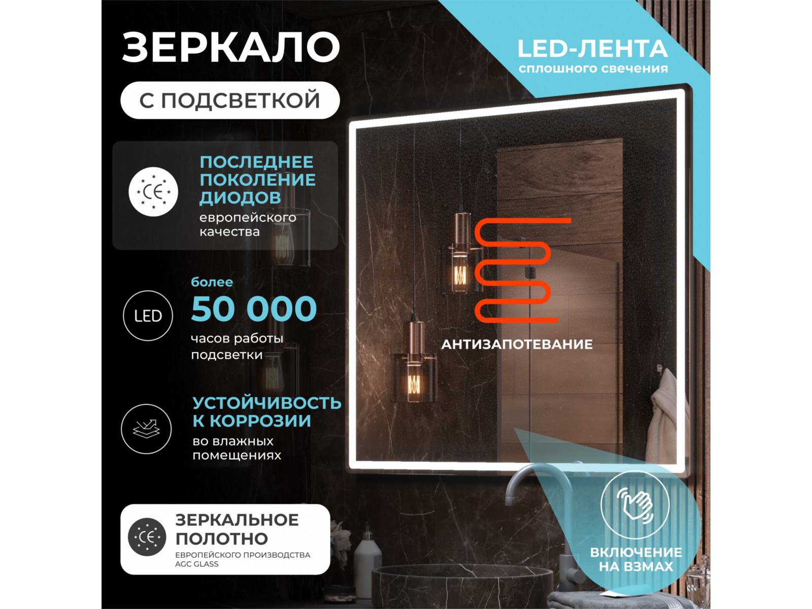 светодиодная подсветка по периметру; сенсорное управление; антизапотевание; включение на взмах