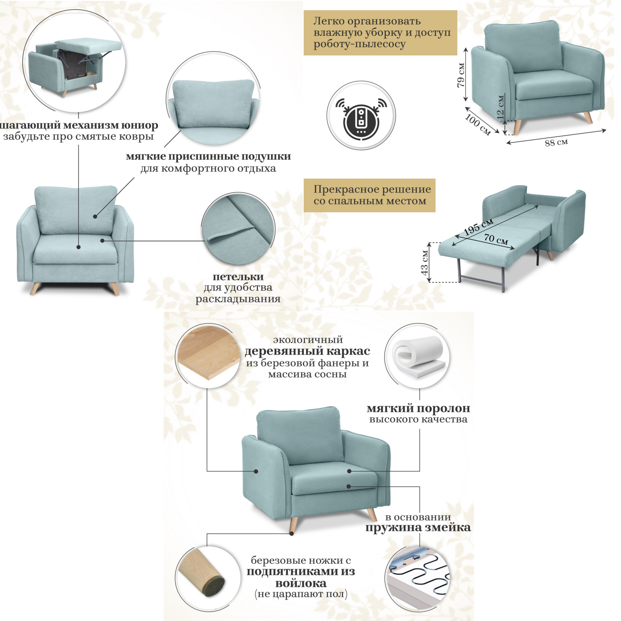- Спальное место: 700х1950 мм