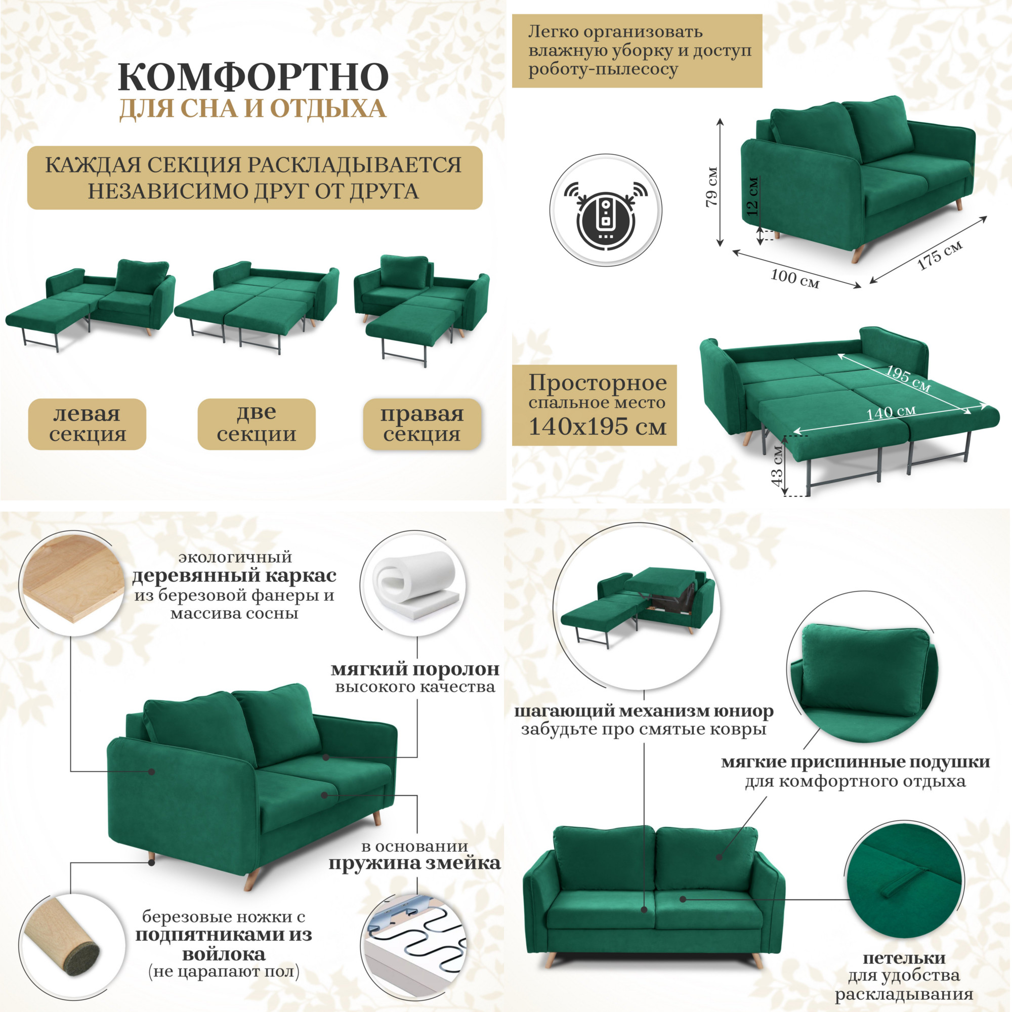 Диван 4444 ткань Вивальди 11 изумрудный