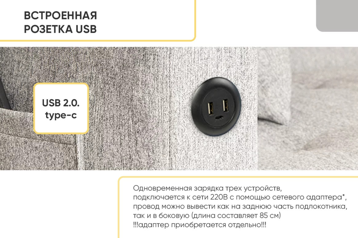 Провод можно вывести как на заднюю часть подлокотника, так и в боковую. В комплект входит: разъем зарядного кабеля - 1 шт. Для подключения розетки понадобится сетевой адаптер с USB 2.0.