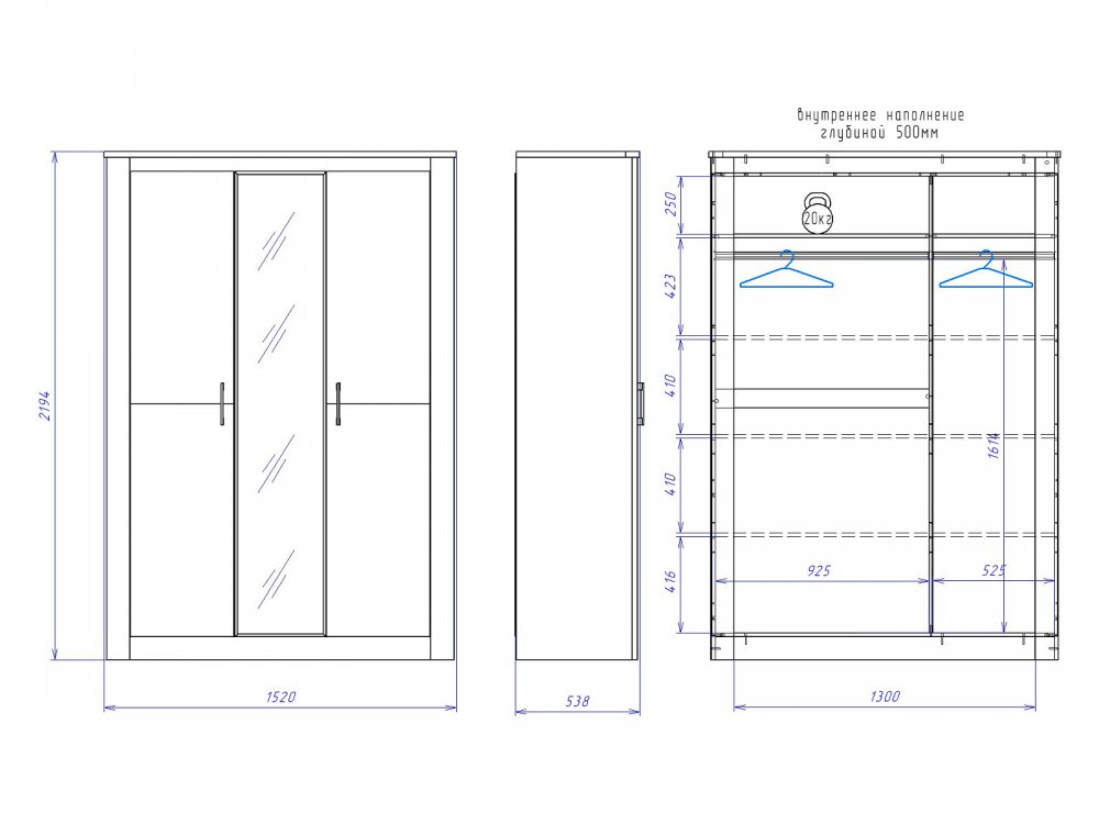 - Шкаф 3-х дверный 2194 Денвер Риббек серый