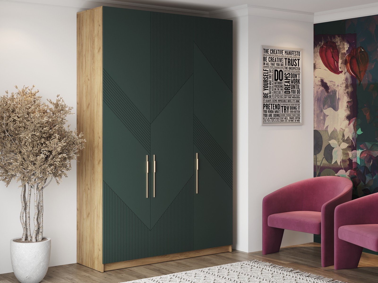 Две оставшиеся секции, габаритами Д.482хВ.2254хГ.490мм., расположены по бокам от центральной и идентичны друг другу. В низу и наверху имеются несъемные полки-вязки, пространство над и под которыми по 300мм. Между полками имеется пространство в 1622мм высотой и 490мм глубиной, в котором расположена овальная металлическая штанга на металлических штангодержателях для одежды. Штанга располагается на высоте 1957мм. от уровня пола, расстояние от штанги до нижней вязки – 1546мм