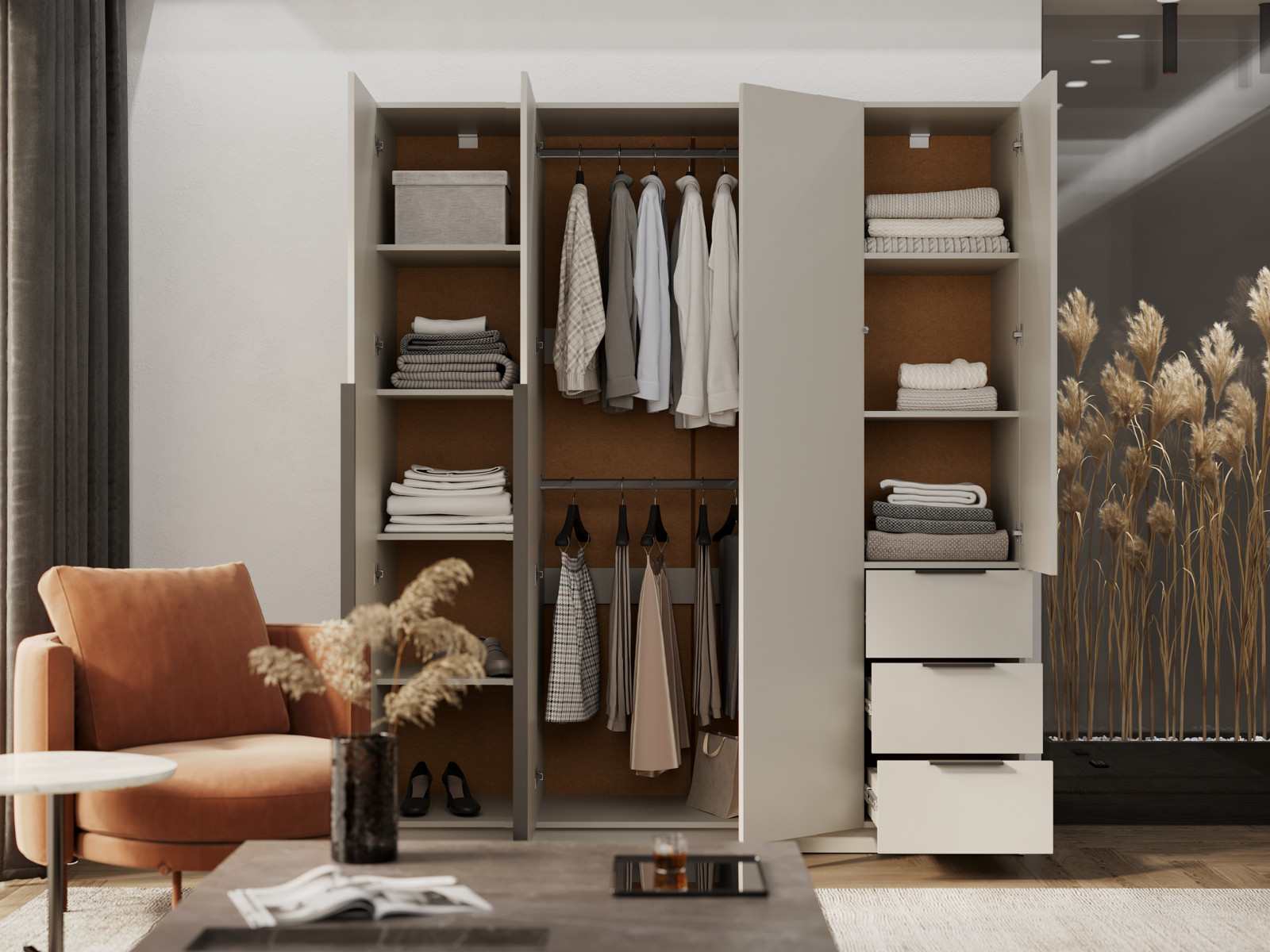 За крайней правой створкой расположены полки(съёмные) и вязки(несъёмные).