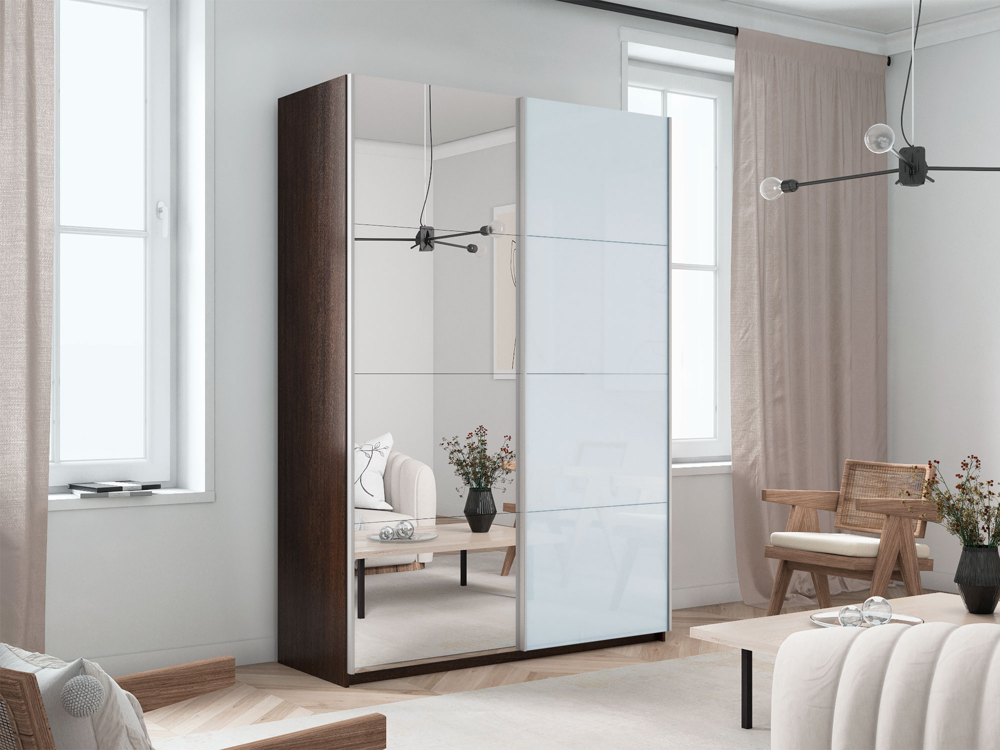 - Шкаф-купе Прайм 2-х дверный 1200 Зеркало/Стекло Белое Венге