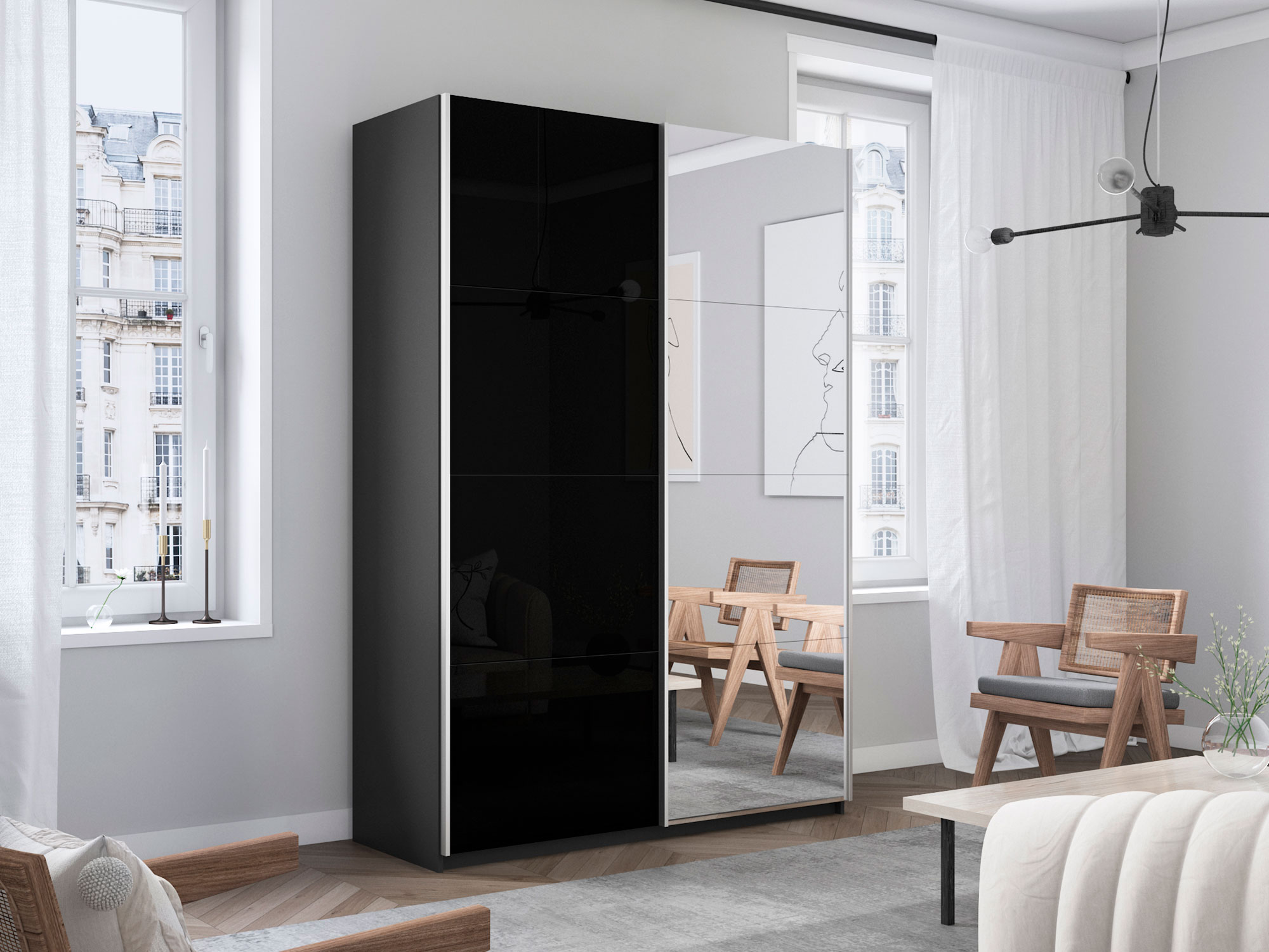 - Шкаф-купе Прайм 2-х дверный 1200 Зеркало/Стекло Черное Серый Диамант