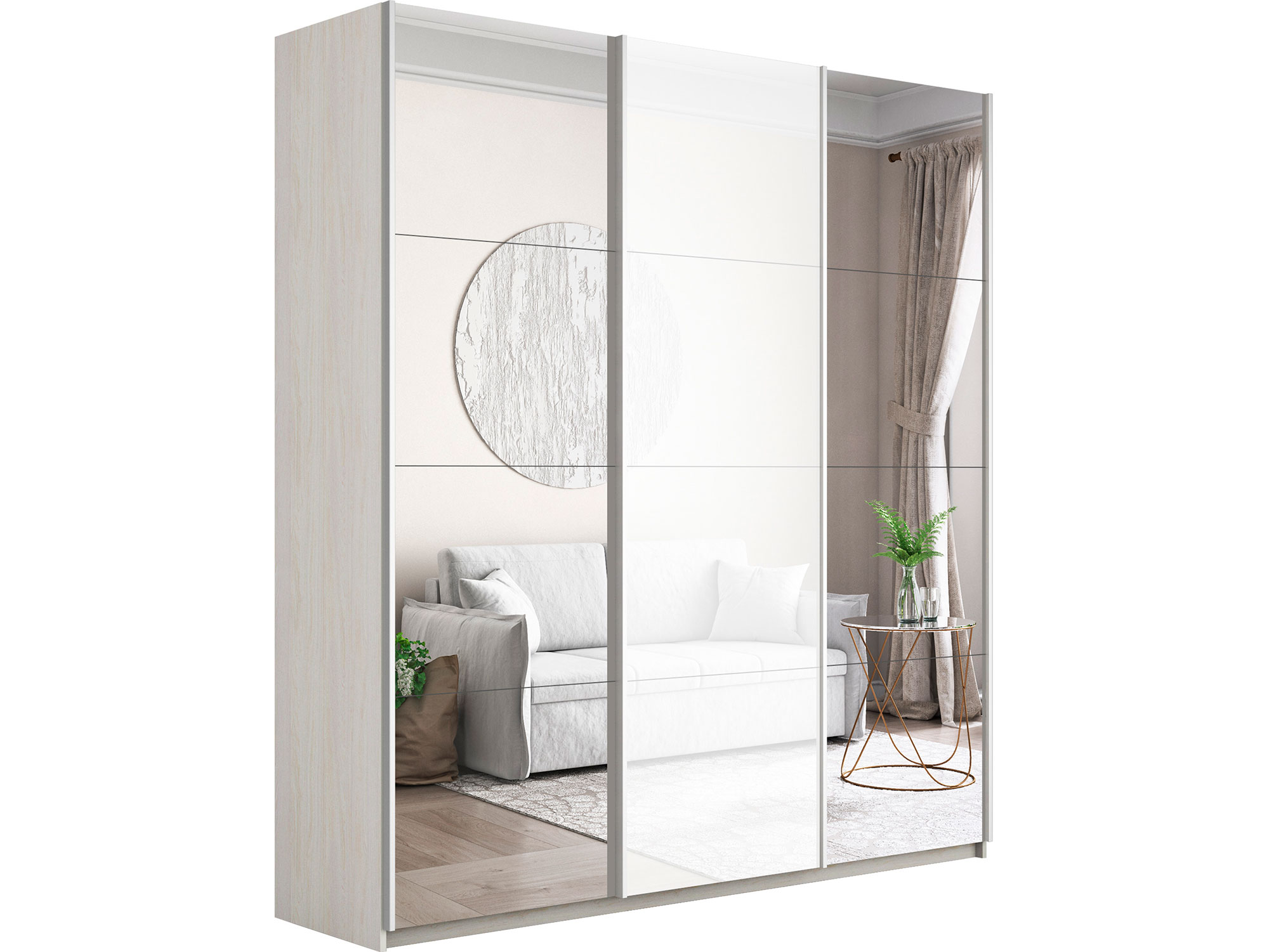 Шкаф-купе Прайм 3-х дверный 1800 Зеркало/Стекло Белое/Зеркало Ясень Анкор Светлый