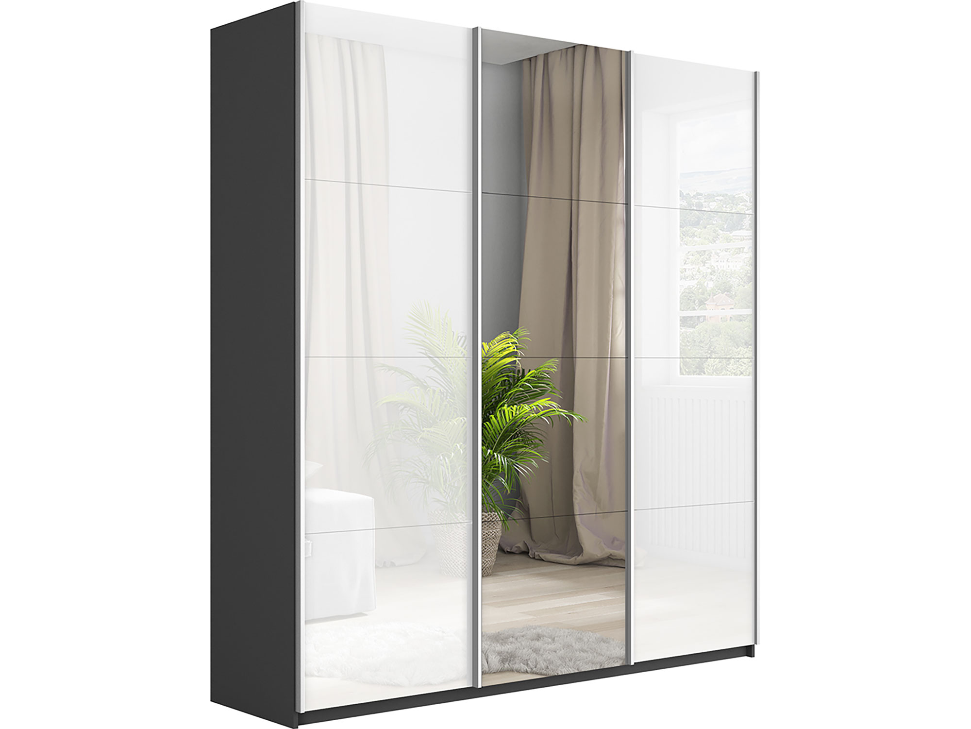- Шкаф-купе Прайм 3-х дверный 2100 два Стекла Белые/Зеркало Серый Диамант