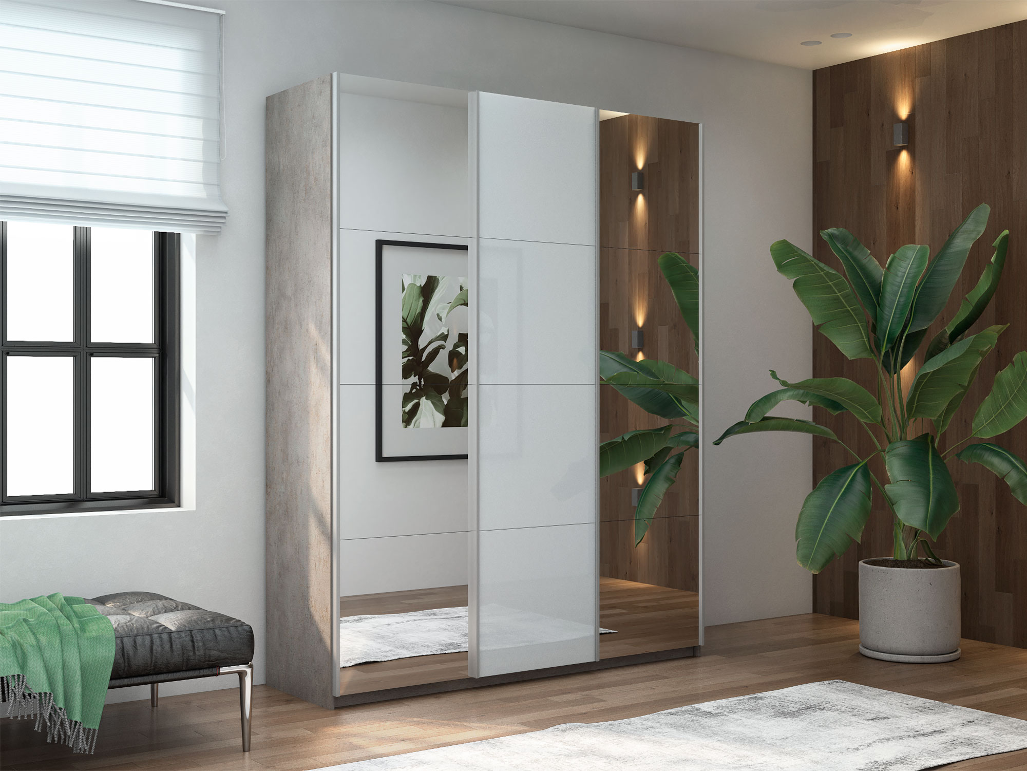 - Шкаф-купе Прайм 3-х дверный 2100 Зеркало/Стекло Белое/Зеркало Бетон