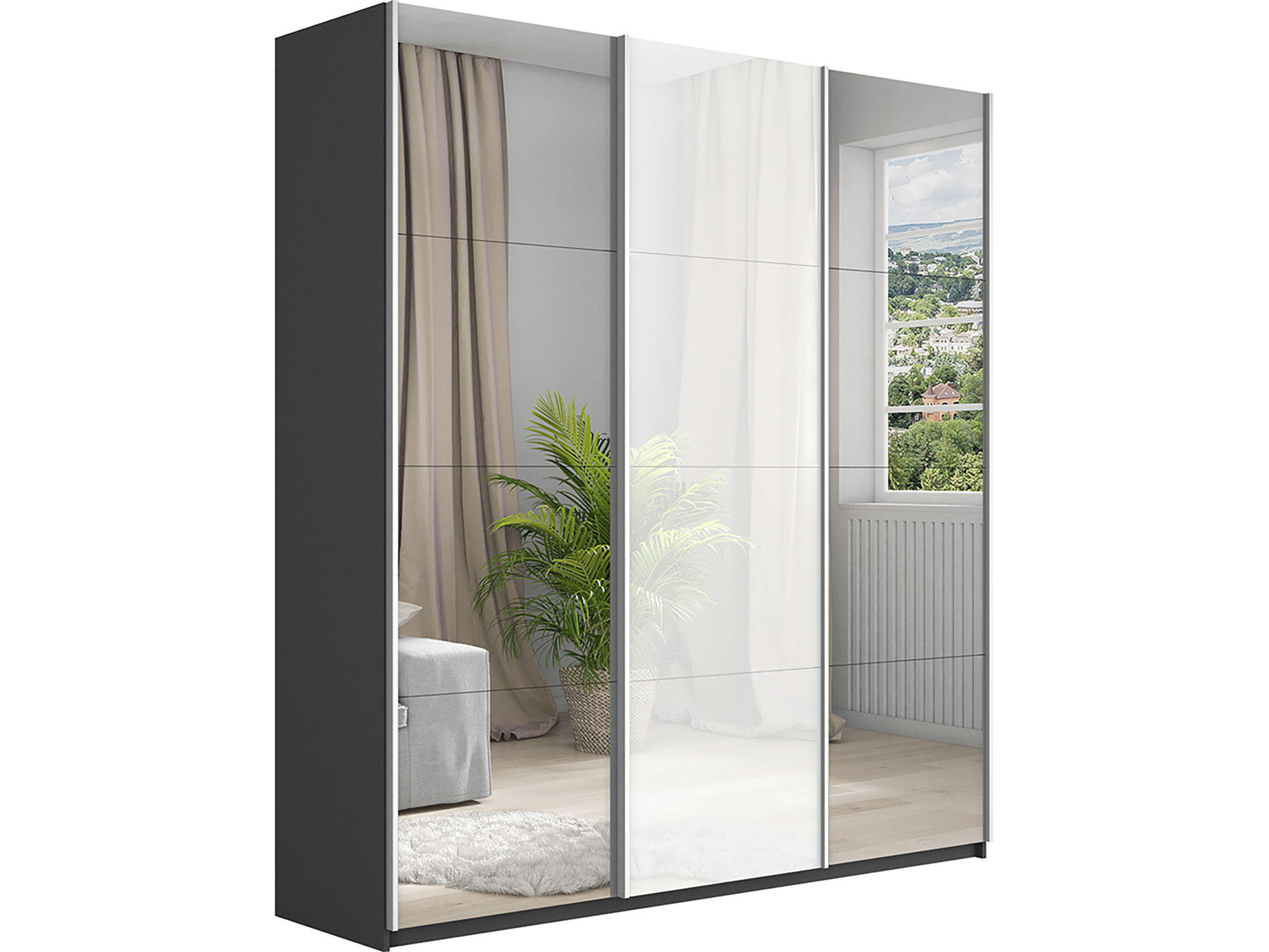 Шкаф-купе Прайм 3-х дверный 2100 Зеркало/Стекло Белое/Зеркало Серый Диамант