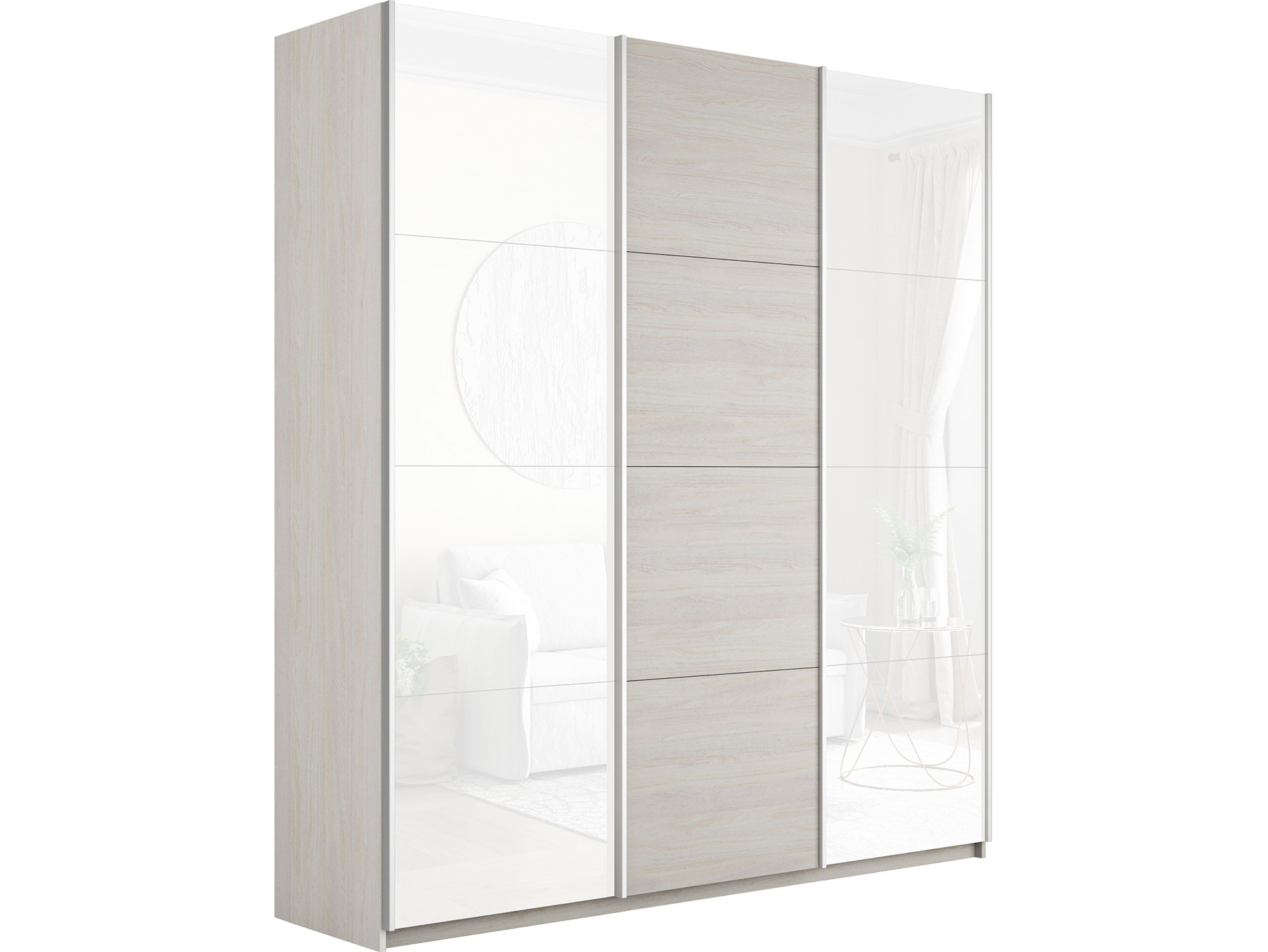 - Шкаф-купе Прайм Широкий 3-х дверный два белых стекла/ДСП Ясень Анкор Светлый