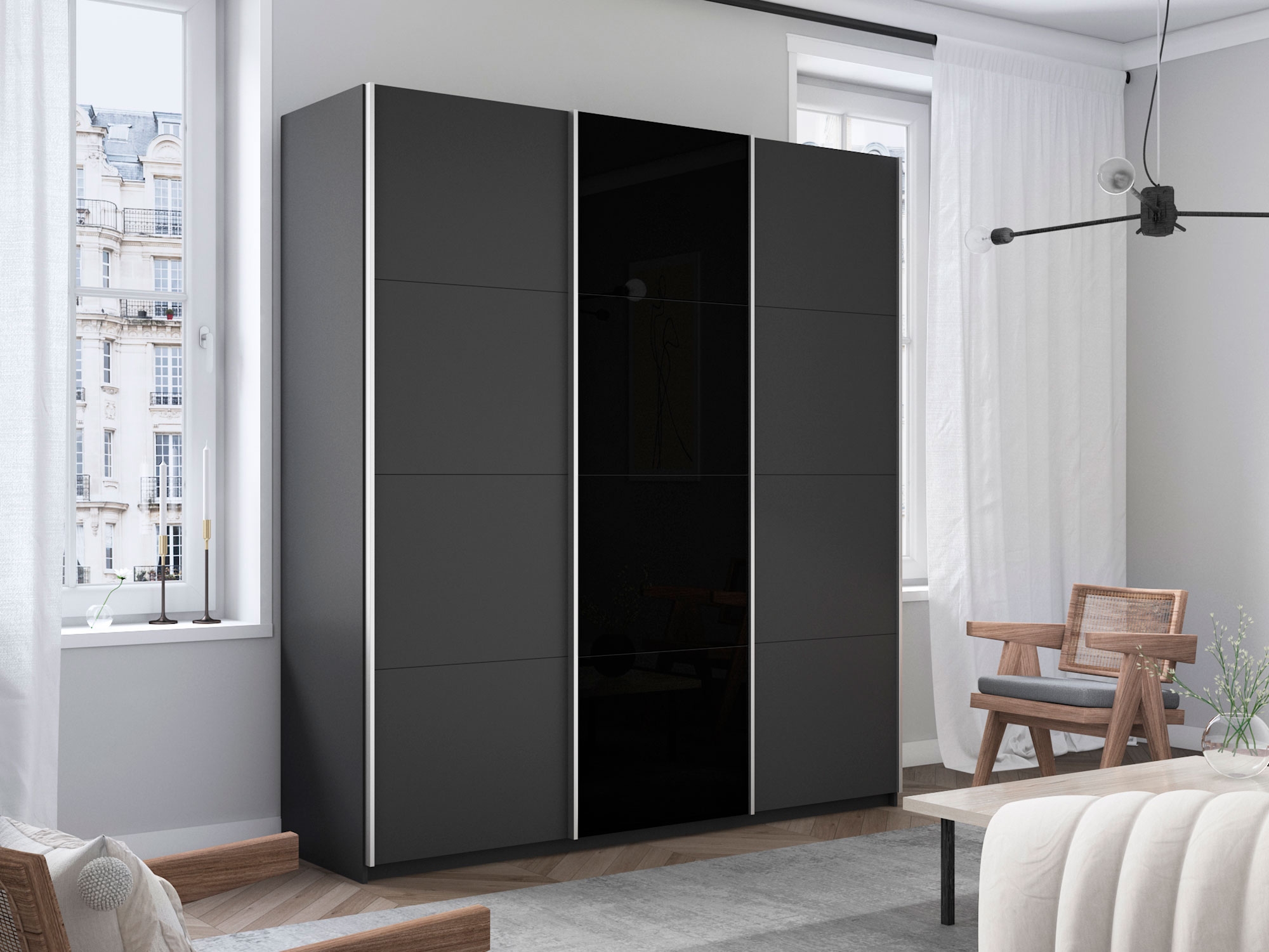Шкаф-купе Прайм Широкий 3-х дверный два ДСП/Стекло Черное Серый Диамант