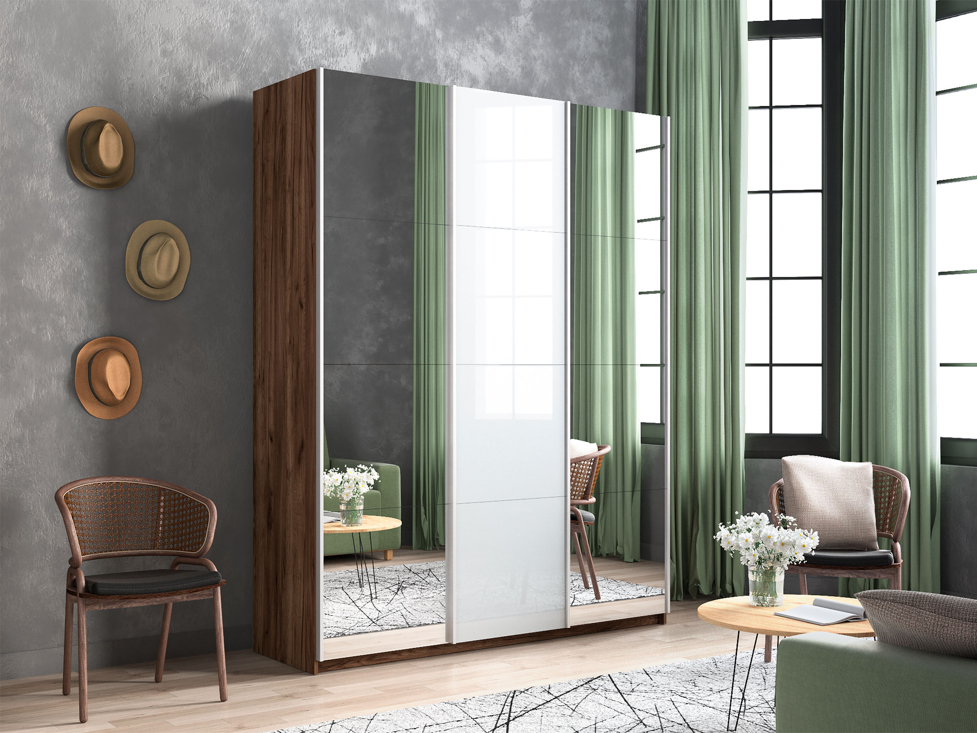 - Шкаф-купе Прайм Широкий 3-х дверный два зеркала/стекло белое Крафт табачный
