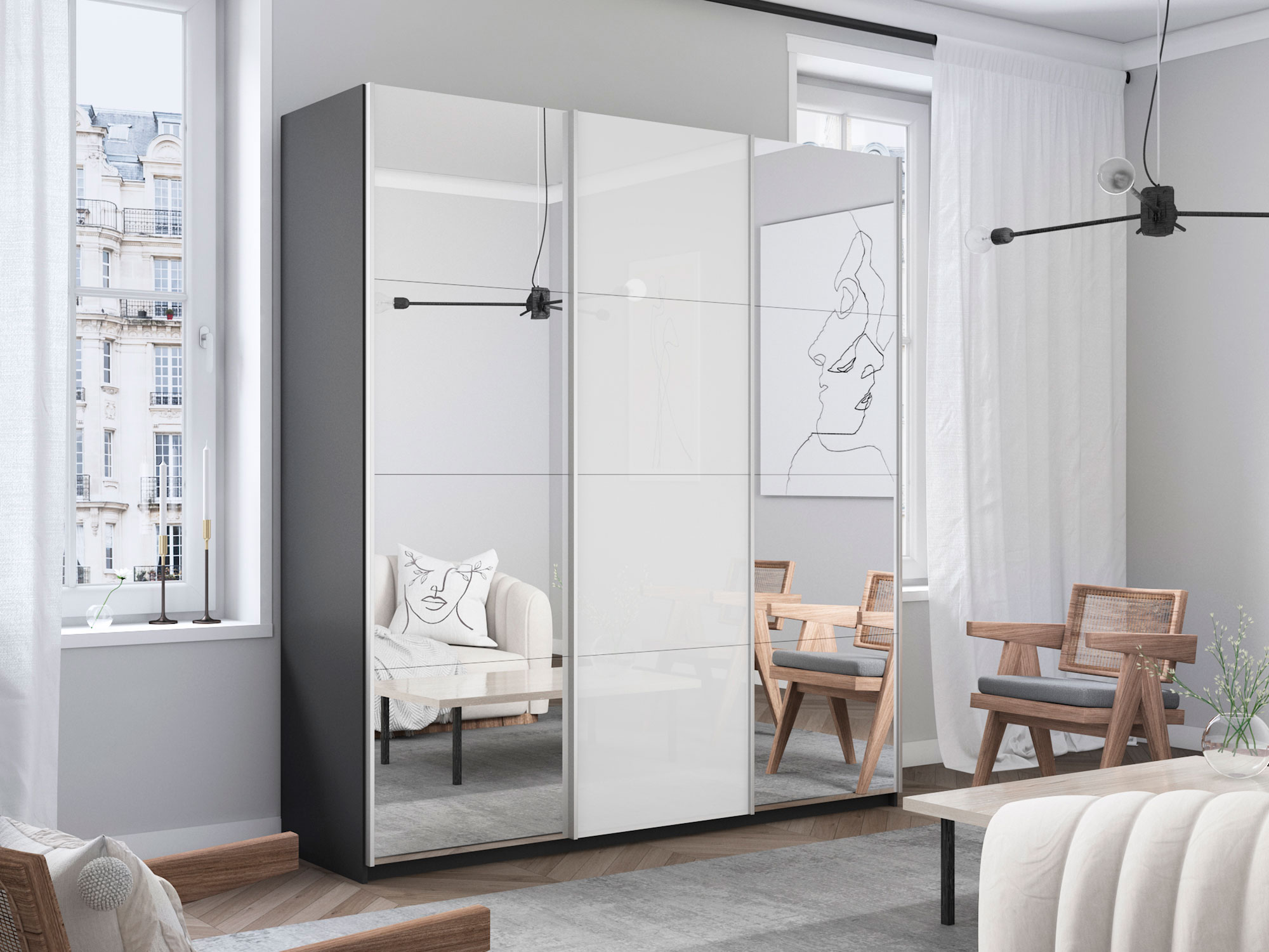 - Шкаф-купе Прайм Широкий 3-х дверный два зеркала/стекло белое Серый Диамант