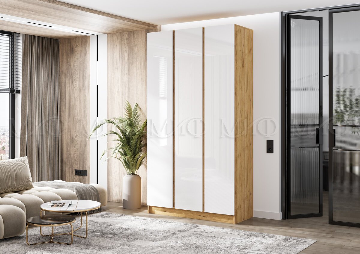 - Шкаф трехстворчатый Келвин (1200) Белый Глянец, Дуб Крафт-вставка дуб крафт
