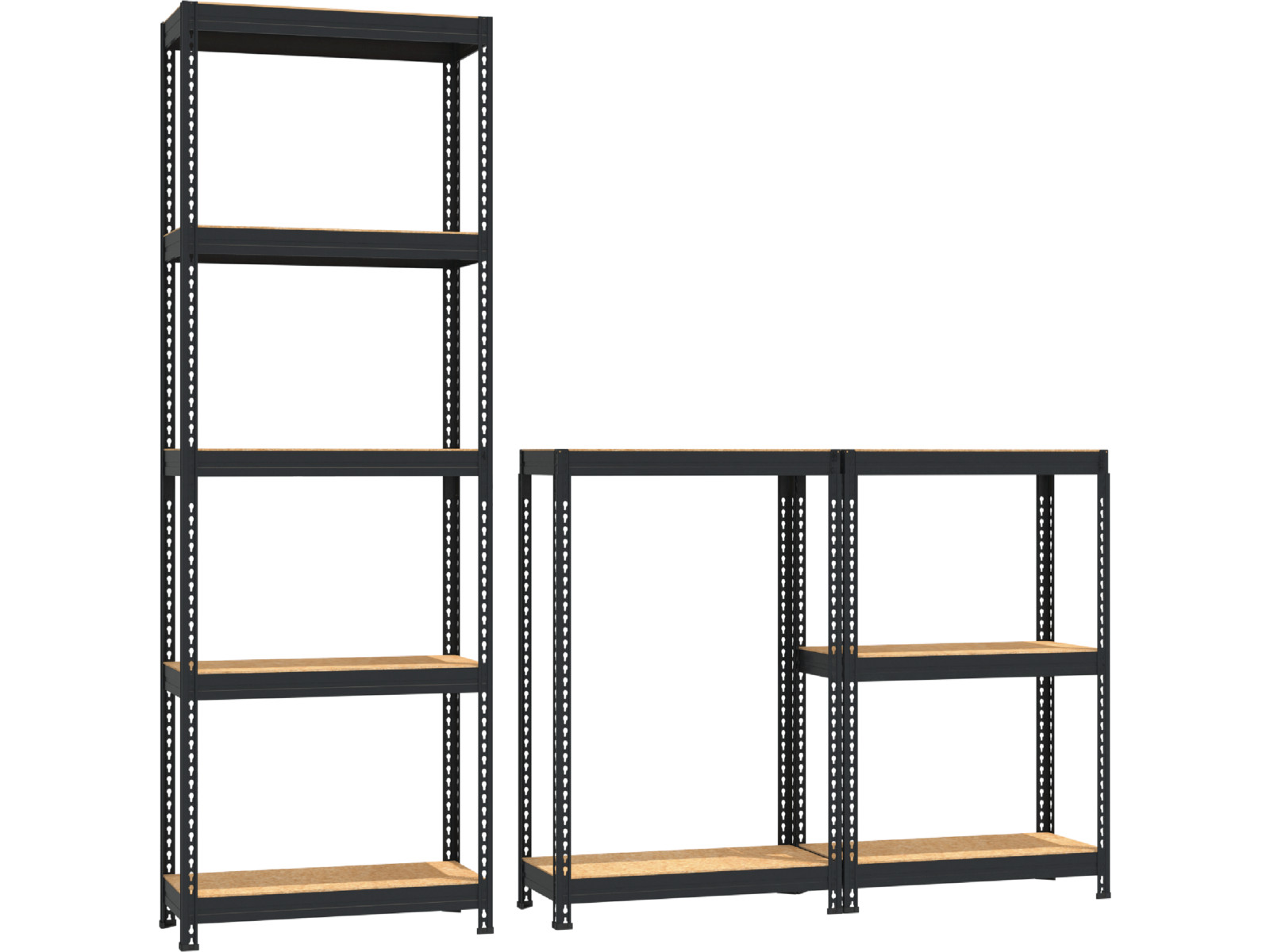 Возможен комбинированный вариант сборки комплекта из 2-х стеллажей высотой 0.9 м с двумя и тремя полками. Максимальная равномерно распределенная нагрузка в этом варианте сборки на каждый ярус не должна превышать 170 кг.